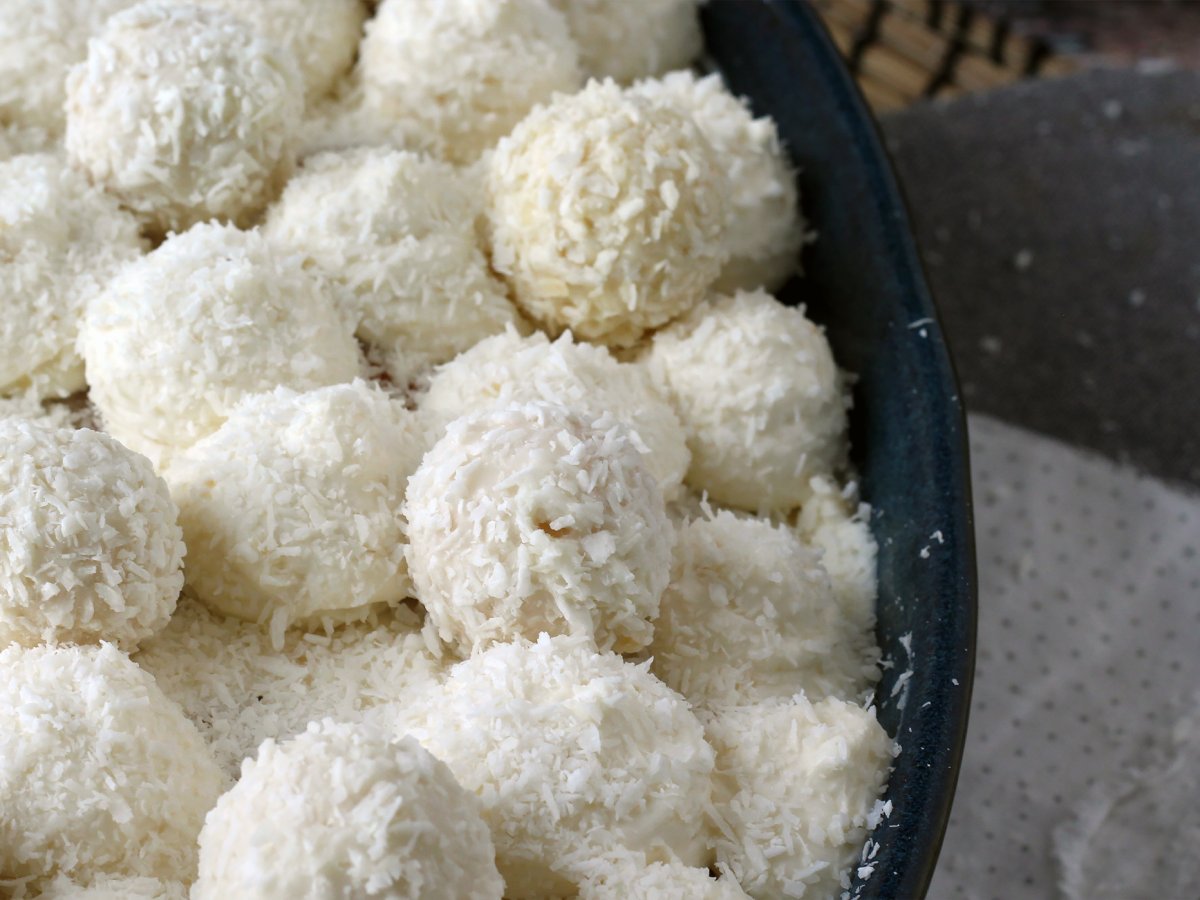 Die Raffaello in den Fleischwolf geben. Kokosraspeln hinzufügen und mixen.