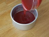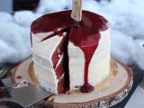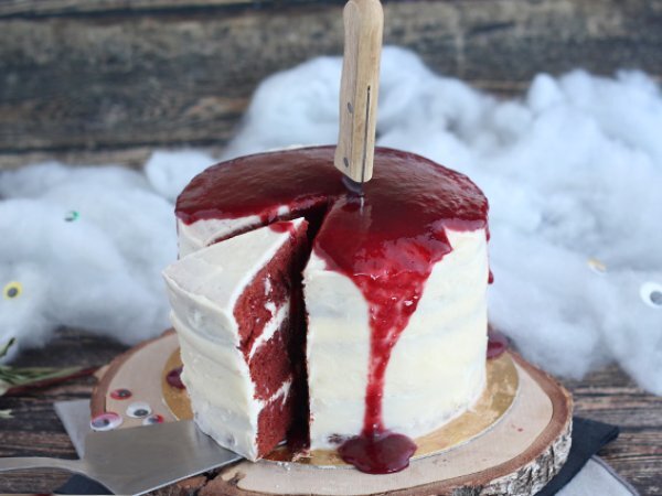 Für eine Halloween-Dekoration haben wir Himbeercoulis über die Oberseite des Kuchens gegossen und dann ein Messer in den Kuchen gestochen.
