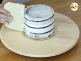 Den dritten Biskuit umgekehrt auflegen. Buttercreme darauf geben und mit einem Horn die Creme um den Kuchen herum und auf der Oberseite glatt streichen, um Unregelmäßigkeiten zu glätten und einen einzigen Kuchen zu erhalten. 30 Minuten kühl stellen.