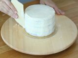 Nehmen Sie die drei Biskuits aus dem Kühlschrank, stellen Sie die Leier so ein, dass sie die drei Biskuits auf die gleiche Größe schneidet, und schneiden Sie dann die Oberseite der Biskuits ab, um flache Kuchen zu erhalten.