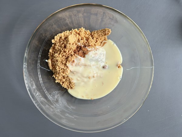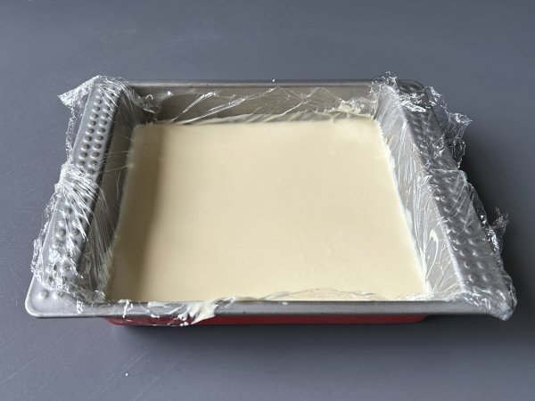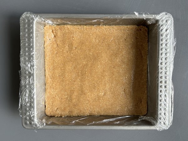Den Boden einer Kuchenform mit Frischhaltefolie oder Backpapier auslegen und darauf achten, dass es über den Rand hinausragt, damit es sich leichter aus der Form lösen lässt. Die Erdnusspaste hineingeben und gut verteilen, mit Hilfe eines Esslöffels, eines Glasbodens oder eines Teigschabers glattstreichen. Im Kühlschrank beiseite stellen und mit dem Rezept fortfahren.