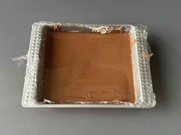 Aus dem Kühlschrank nehmen und die Platte umdrehen. Die Vollmilchschokolade zusammen mit dem Sonnenblumenöl schmelzen und auf dem Boden verteilen, dabei darauf achten, dass sie gut verteilt ist. Erneut auf die Arbeitsfläche klopfen, um sie gleichmäßig zu verteilen.