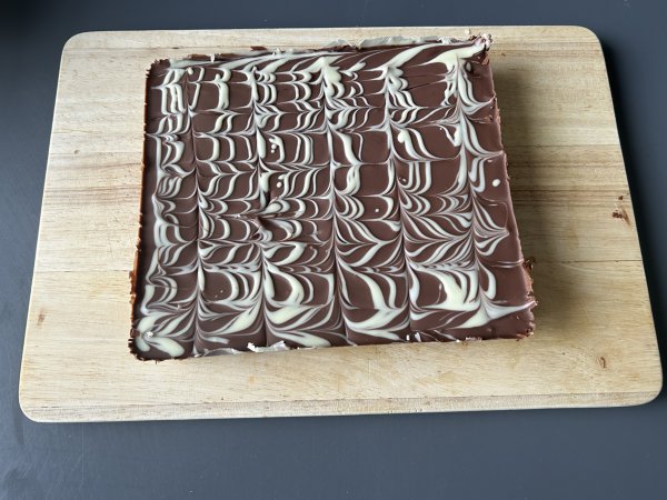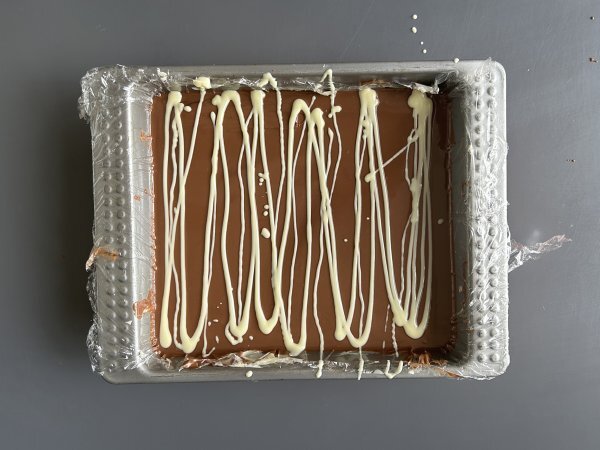 Die restliche weiße Schokolade schmelzen, in einen Spritzbeutel füllen und Linien auf die Milchschokolade spritzen. Es macht nichts, wenn sie nicht ganz gerade oder parallel sind.