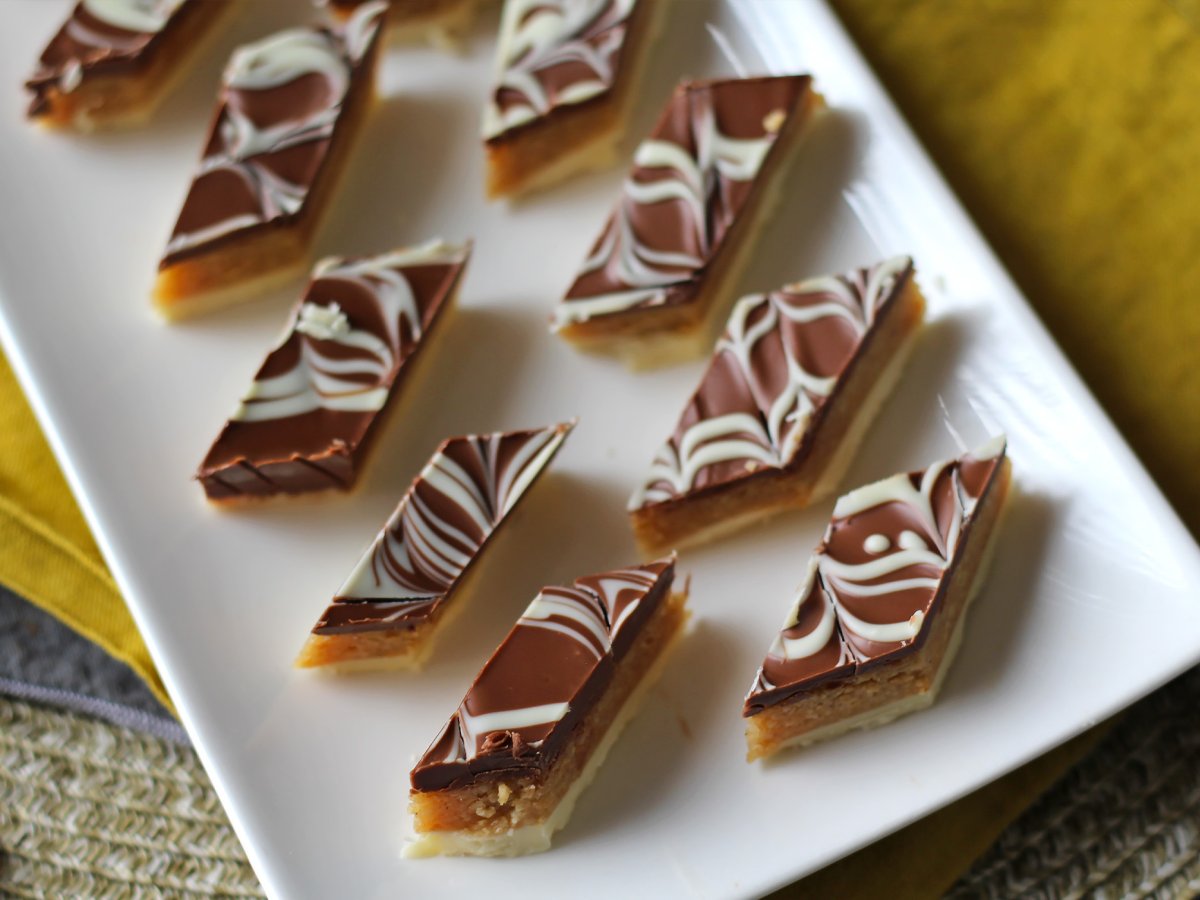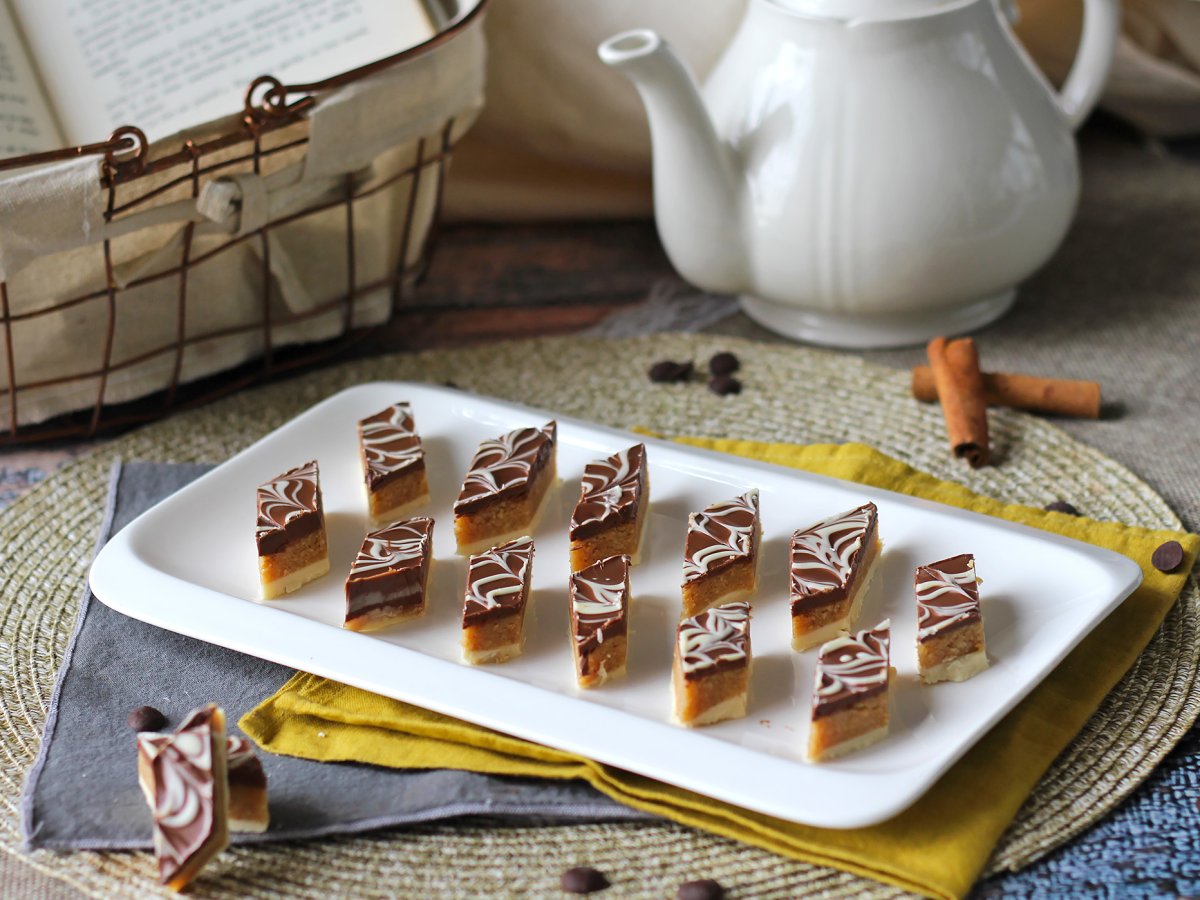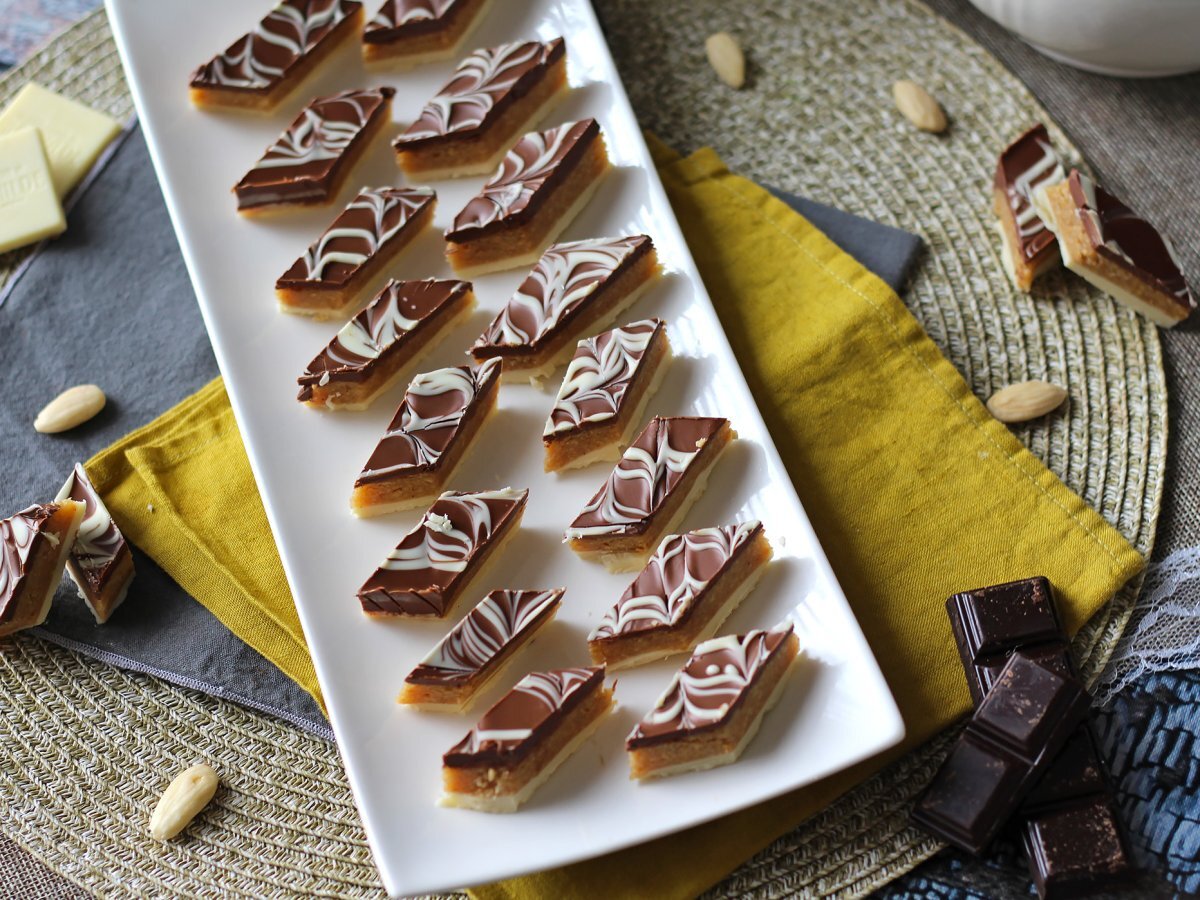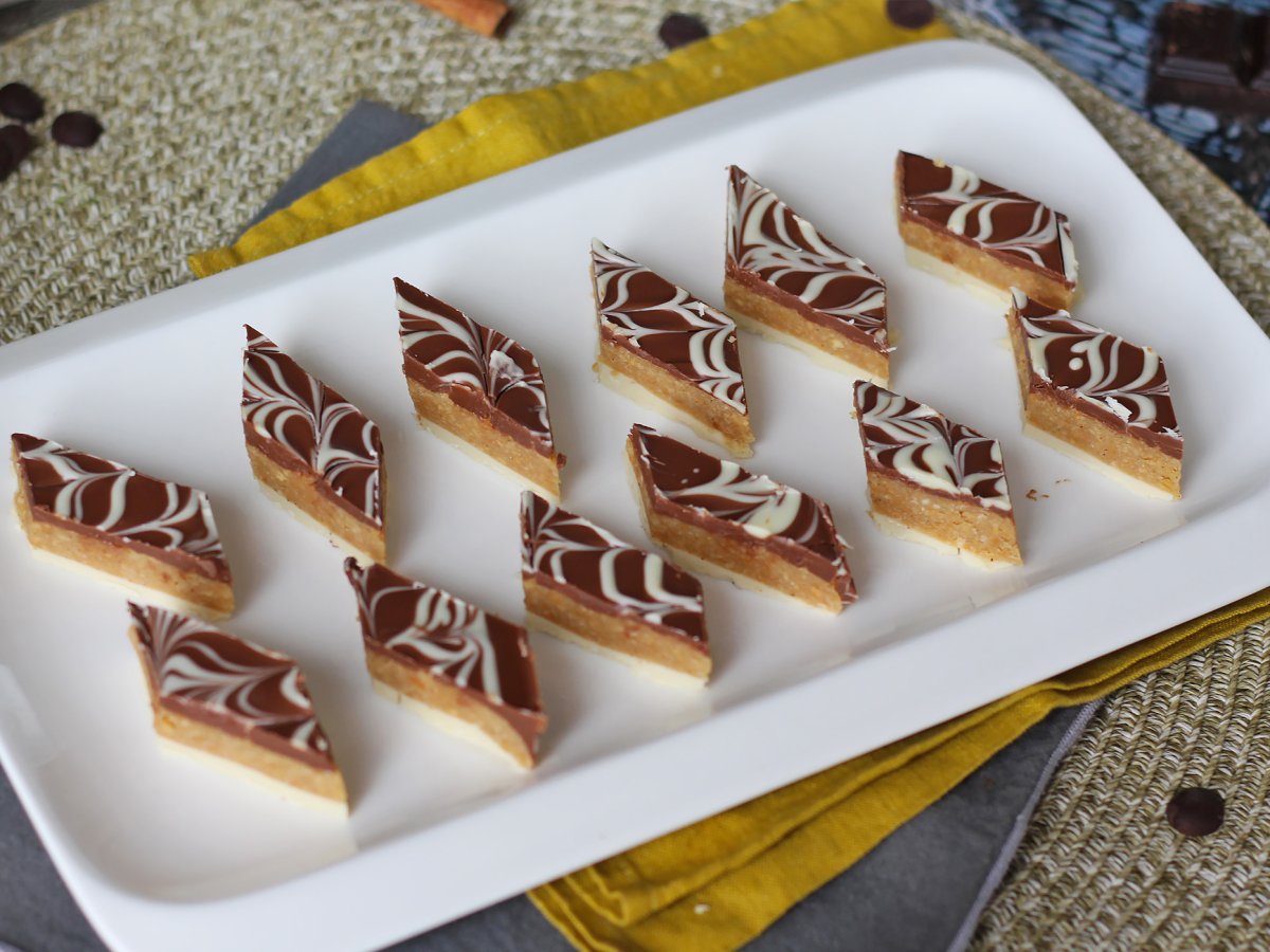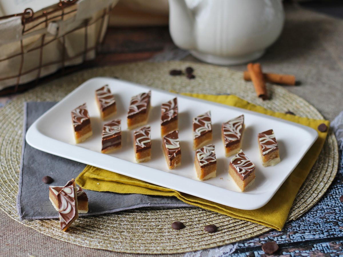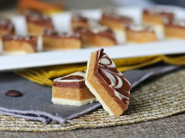 Die weiße Schokolade hacken (einen Teil für den Schluss aufheben), in eine Schüssel geben und einen Teelöffel Sonnenblumenöl hinzufügen. Die Hälfte der Schokolade in der Mikrowelle oder im Wasserbad schmelzen. Mit einem Teigspatel gleichmäßig auf der Erdnusspaste verteilen. Vorsichtig auf die Arbeitsfläche klopfen, um sie gleichmäßig zu verteilen. In den Kühlschrank stellen, bis die Schokolade ausgehärtet ist (etwa 15 Minuten).