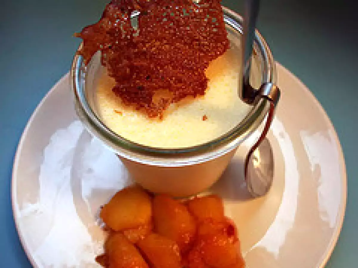 Rosenwasser-pannacotta mit geschmolzenen palmzuckerpfirsichen & rosa-pfeffer-knusperblatt
