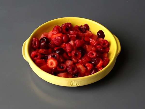 Verteilen Sie die Früchte in einer Schüssel und schließen Sie mit den Himbeeren ab.