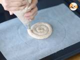 Zeichnen Sie mit einem Spritzbeutel einen Kreis dieser Mischung auf ein Blatt Pergamentpapier. Der Kreis sollte einen Durchmesser von 18 cm haben. Zeichnen Sie ihn auf das Backpapier, bevor Sie den Keks damit bespritzen. 12 Minuten bei 190°C backen.