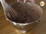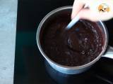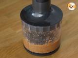Diese Mischung durch ein feines Sieb passieren, um eventuelle Kakaoklumpen zu entfernen. Fügen Sie die Gelatine hinzu, die Sie gut ausgewrungen haben, und verrühren Sie, bis sie sich gut aufgelöst hat. Benutzen Sie auch hier keinen Schneebesen und vermeiden Sie Bewegungen, die Luft in die Mischung bringen.