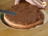 Tragen Sie diese Mischung sofort auf die Haselnuss-Dacquoise auf und glätten Sie sie gut, um eine sehr gleichmäßige Schicht zu erhalten. Kühl stellen.