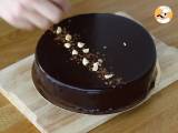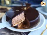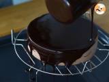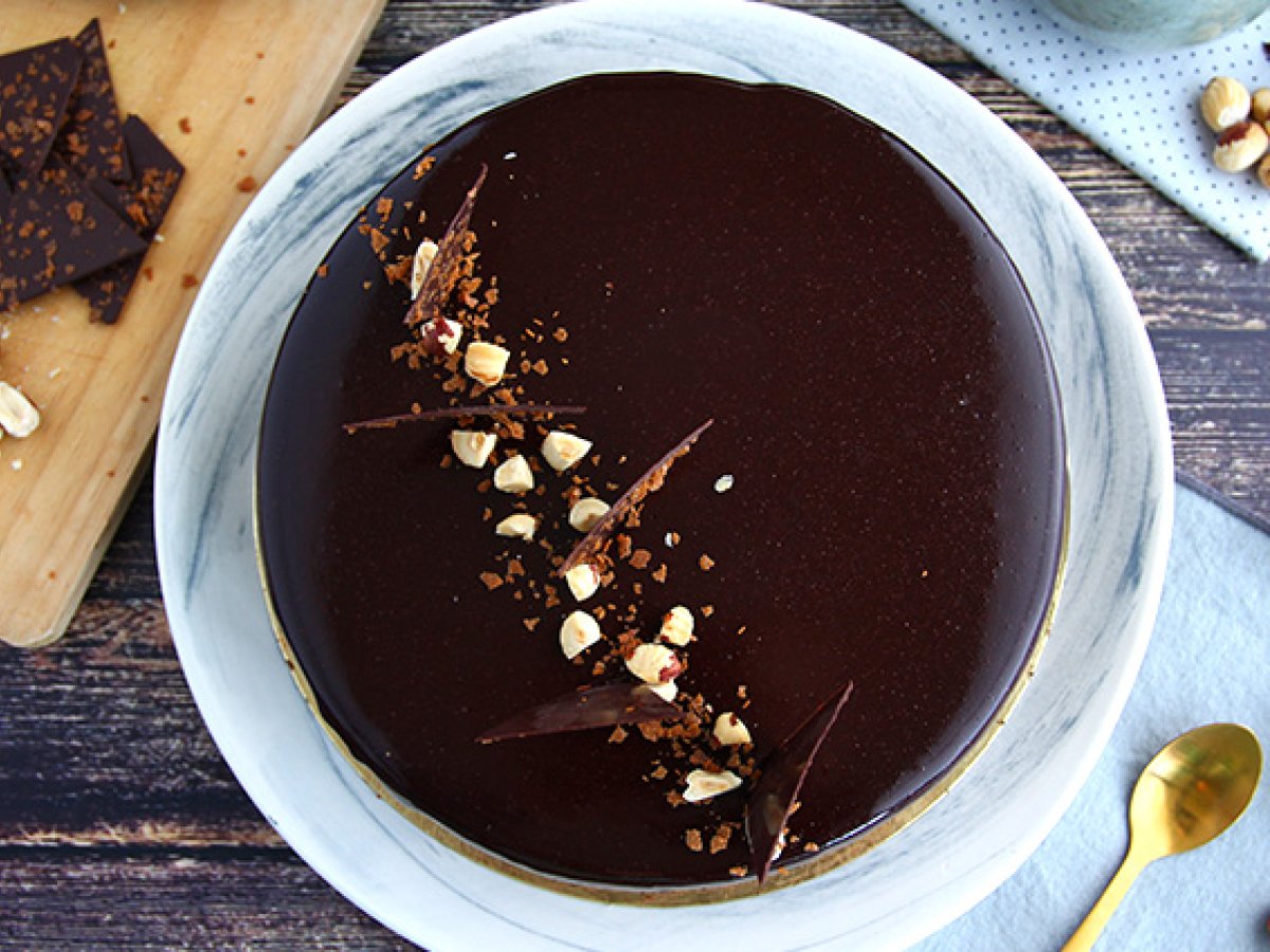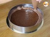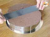 Sobald Sie den Kreis mit Schokoladenmousse gefüllt haben, glätten Sie die Oberseite des Kuchens mit einem abgewinkelten Spatel. Es muss sehr glatt sein, um mit der Glasur ein schönes Ergebnis zu erzielen. Für mindestens 3 Stunden in den Gefrierschrank stellen.