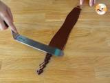 Schneiden Sie einen etwa 25 cm langen Streifen Rhodoïd ab. 50 g dunkle Schokolade schmelzen und über die gesamte Länge des Bandes gießen. Verteilen Sie die Masse mit einem Spatel so, dass sie den gesamten Streifen bedeckt. Zerkleinern Sie 2 bis 3 Pailletten-Spitzen-Crêpes und streuen Sie diesen Streifen darüber. Mit der Messerspitze von der Arbeitsfläche abziehen und für etwa 15 Minuten in den Kühlschrank stellen.