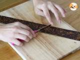 Nehmen Sie Ihren Schokoladenstreifen heraus und schneiden Sie Dreiecke mit einem Messer (tauchen Sie es in kochendes Wasser und wischen Sie es vorher ab, um das Schneiden zu erleichtern).
