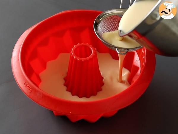 Nehmen Sie die Form aus dem Kühlschrank. Die Flan-Mischung (Teig) durch ein Sieb auf das Karamell gießen, sodass der Teig glatt bleibt.