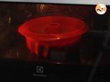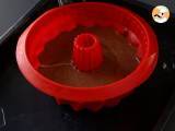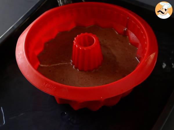 Geben Sie dann den Schokoladenkuchenteig darüber, stellen Sie die Form auf einen hohlen Teller und gießen Sie kochendes Wasser in den Teller, um ein Wasserbad zu erhalten.