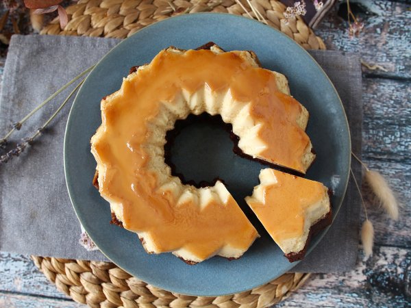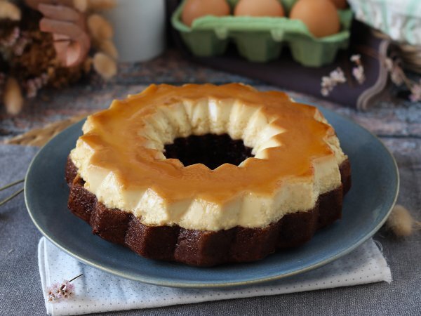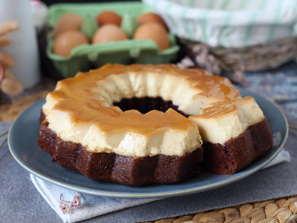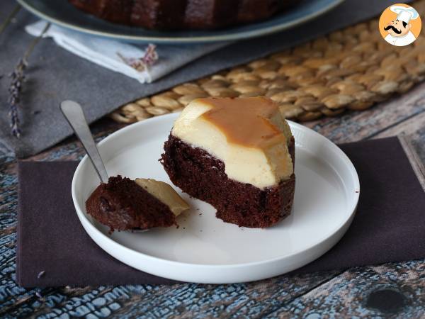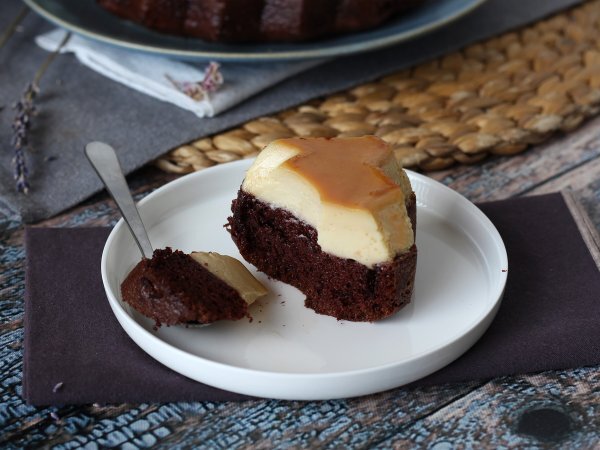 Schoko-flan, die perfekte kombination aus weichen schokoladenkuchen und karamell-flan