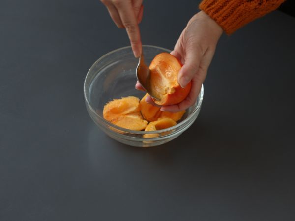 Das Fruchtfleisch der Kakis mit einem Löffel herauslösen.