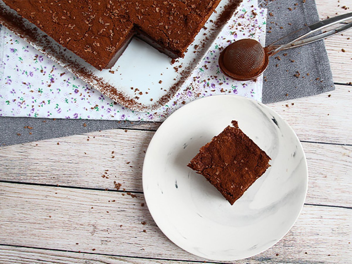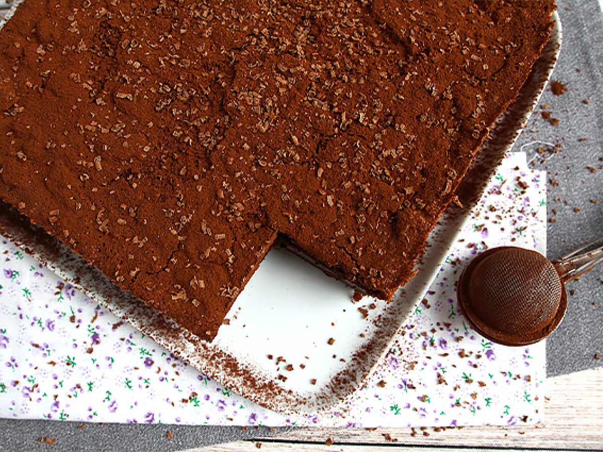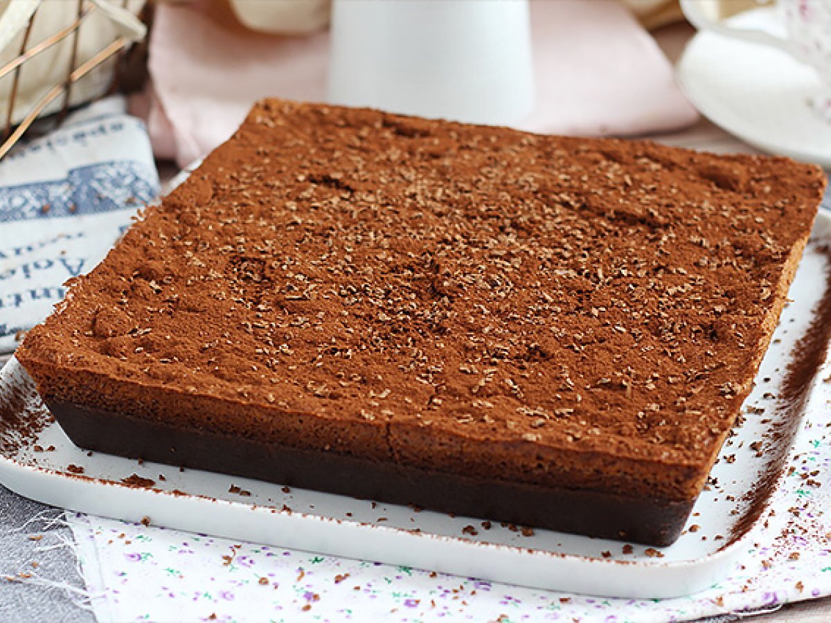 Los geht's, Ihr magischer Schokoladenkuchen ist fertig! Streuen Sie wie wir Kakao darüber und raspeln Sie die Schokolade oder streuen Sie zum Dekorieren sie mit Puderzucker.