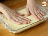 Decken Sie den Boden einer Auflaufform mit Frischhaltefolie ab und gießen Sie dann die Sahne darüber. Decken Sie die Creme mit Plastikfolie ab, um die Bildung einer Haut zu verhindern. Einige Stunden kalt stellen.