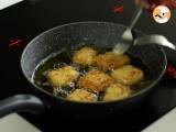 Das Frittieröl in einer Bratpfanne gut erhitzen, dann die Sahnewürfel hineinlegen. Von allen Seiten goldbraun braten, dann auf ein Papiertuch legen.