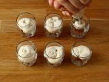 Legen Sie die großen Spekulatiusstücke auf den Boden der Verrines. Mit einem Spritzbeutel (oder einem Löffel) großzügig mit Sahne bedecken.