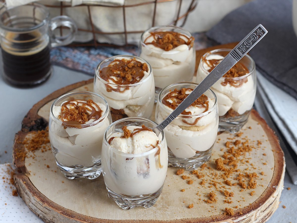 Legen Sie ein Stück eingeweichten Löffelbiskuits darauf und bedecken Sie es mit der Mousse. Etwas geschmolzene Spekulatiuspaste darübergießen.