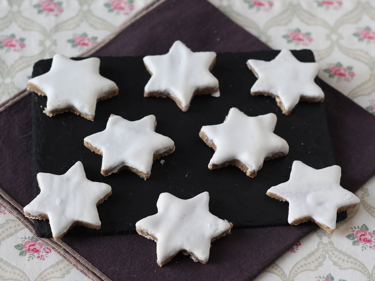 Legen Sie die restlichen 100 g Haselnusspulver auf die Arbeitsfläche und rollen Sie Ihre Teigkugel darauf mit dem Nudelholz etwa 8 bis 10 mm dick aus. Formen Sie mit dem Ausstecher Sterne.