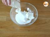 Geben Sie den Mascarpone, den Zucker und die sehr kalte flüssige Sahne in eine Schüssel und schlagen Sie, bis eine feste Creme entsteht.