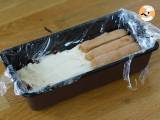 Legen Sie Ihre Kuchenform mit Frischhaltefolie aus. Tauchen Sie die Löffelbiskuits kurz in den kalten Kaffee und bedecken Sie den Boden der Form damit.