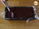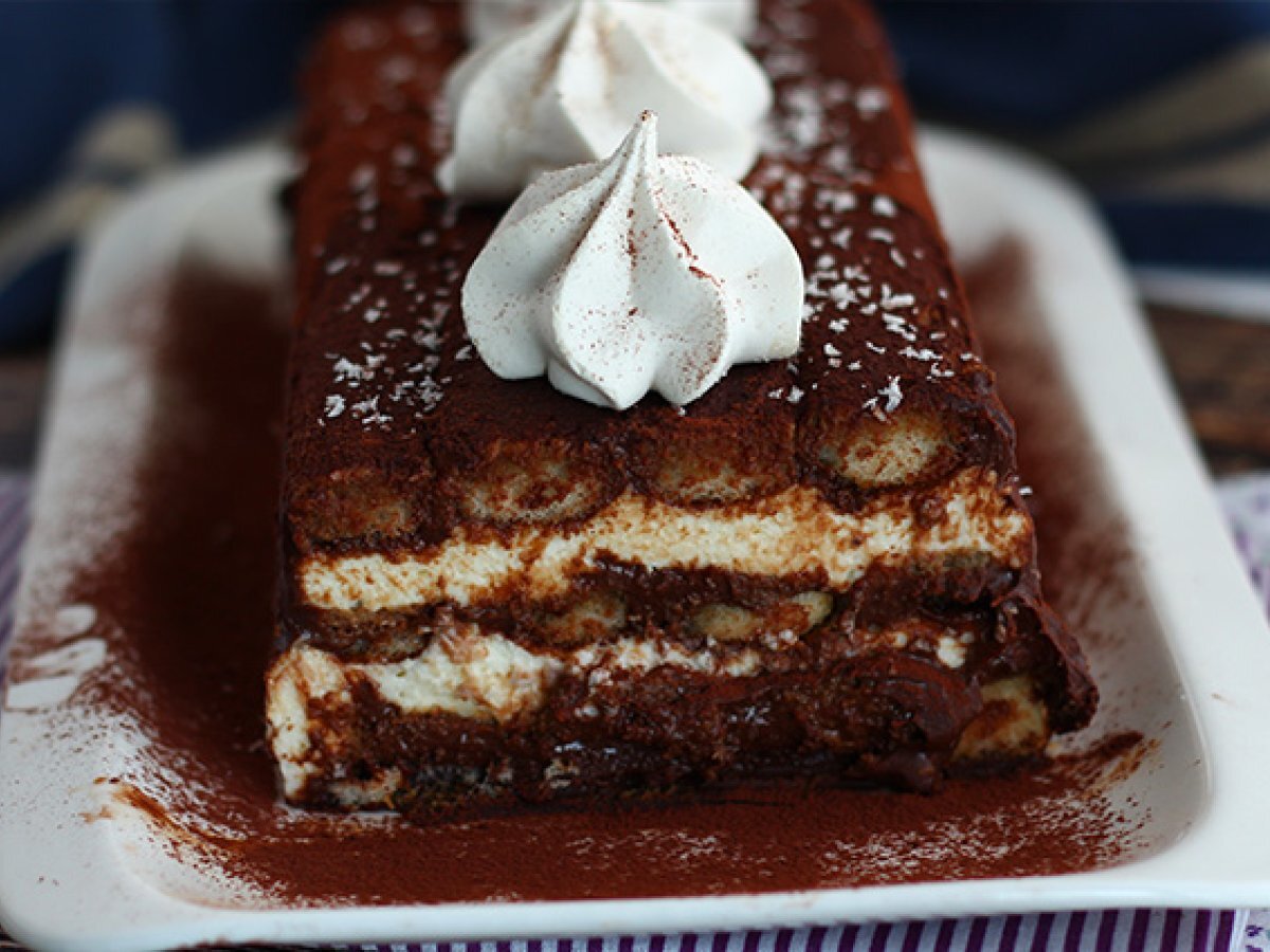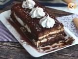 Decken Sie die Creme mit einer letzten Schicht kaffeegetränkter Kekse ab und bedecken Sie sie abschließend mit der restlichen Schokoladenganache. Kühlen Sie das Holzstück mindestens 3 Stunden lang.
