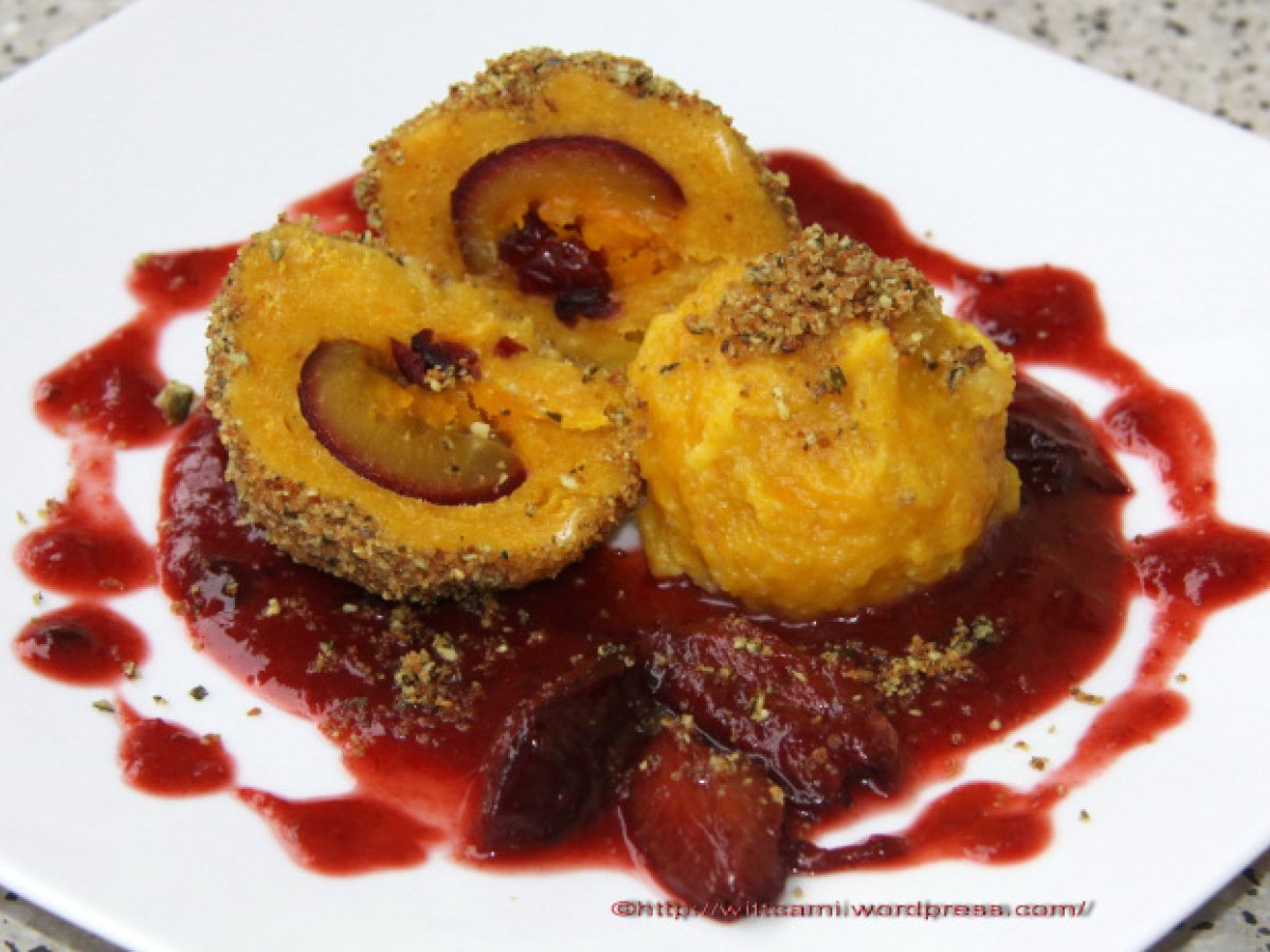 - Schneiden Sie die restlichen Pflaumen auf einer Seite offen ist und entfernen Sie den Stein. Presse im Zucker. Füllen mit Kürbis und Moosbeeren und schließen Sie es.