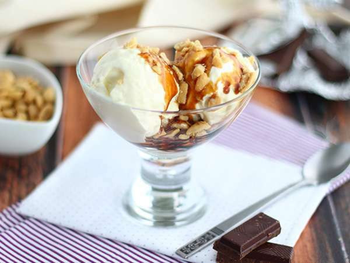 Ja, Sie können das Eis ganz nach Ihrem Geschmack zubereiten und das Karamell weglassen oder durch eine andere Sauce ersetzen.