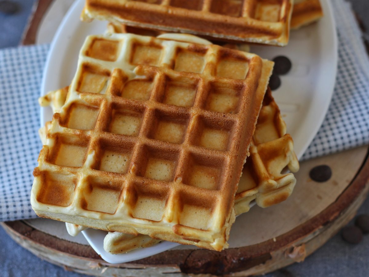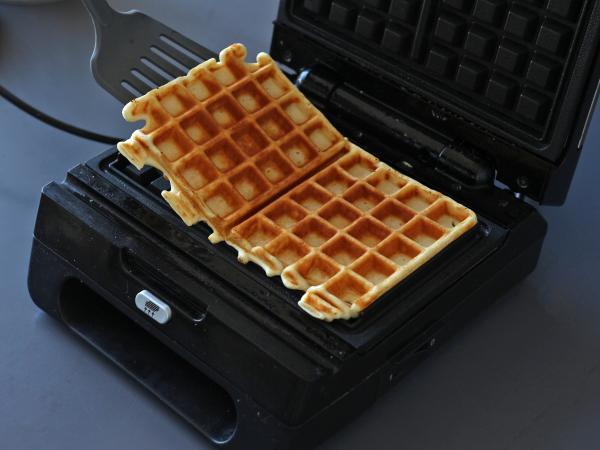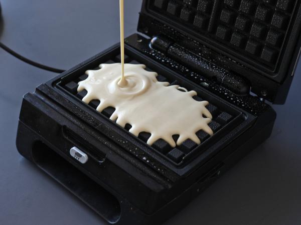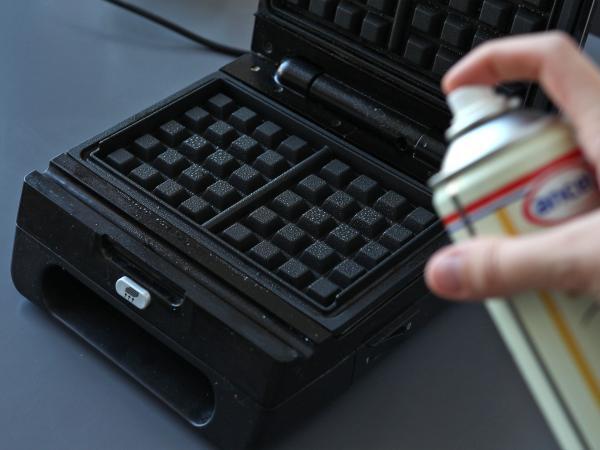 Es ist wichtig, das Waffeleisen gut vorzuheizen und es mit einem Ölspray einzufetten, damit die Waffeln nicht ankleben.