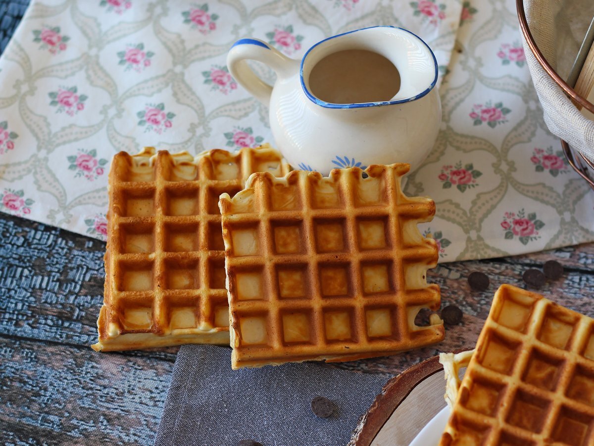 Den Teig in das Waffeleisen geben. Die Waffeln etwa 3 Minuten lang backen (hängt von der Leistung des Waffeleisens ab).