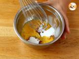 Die Eier mit braunem Zucker, weißem Zucker, einer Prise Salz und Vanilleextrakt verquirlen.