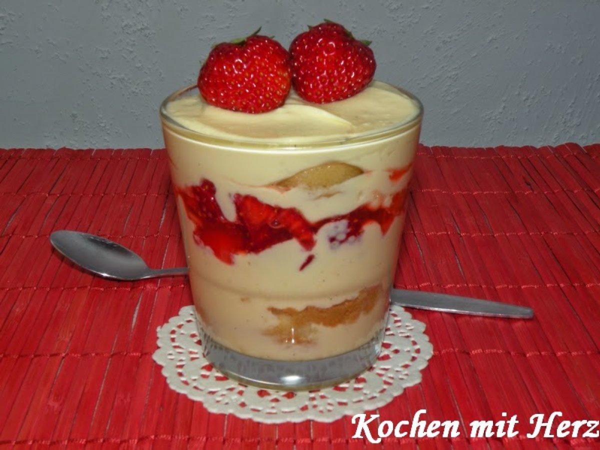 - Eine Schicht Creme und eine Schicht Erdbeeren darüber.