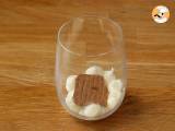 Platzieren Sie zunächst die Sahne auf dem Boden des Glases. Die Spekulatiushälften halbieren und nach und nach in Kaffee einweichen. Die eingeweichten Kekse auf die Sahne legen.