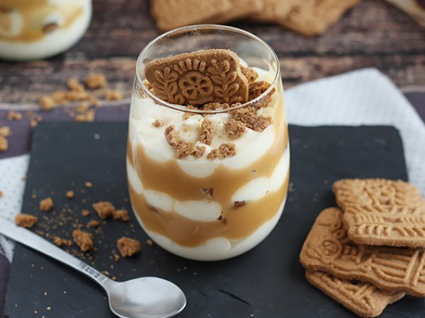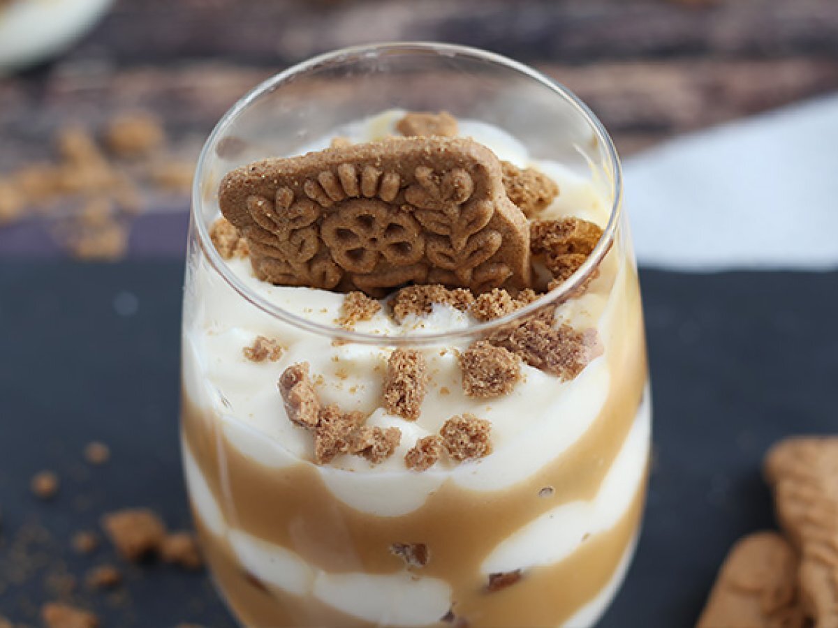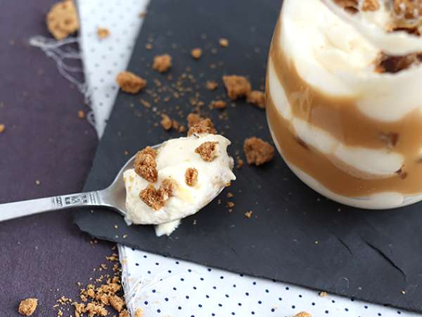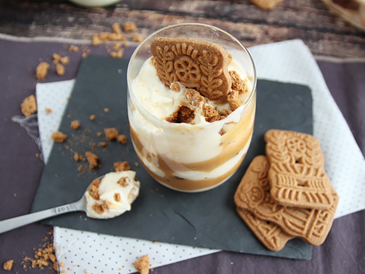 Es ist fertig! Streuen Sie mit zerkleinerten Speculoos und legen Sie eine halbe Speculoos in die Sahne.