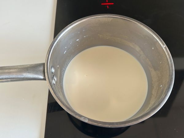 Milch, Sahne, Vanilleextrakt und Zucker in einen Kochtopf gießen. Zum Kochen bringen. Wenn es kocht, vom Herd nehmen.