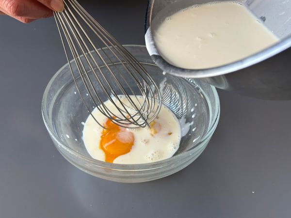Die beiden Eigelbe in eine große Schüssel geben. Unter ständigem Rühren mit einem Schneebesen nach und nach die warme Milch hinzufügen.