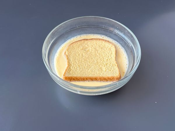 Wenn die Mischung fertig ist, die Brioche-Scheiben nacheinander einweichen. Die benötigte Zeit hängt davon ab, ob die Brioche frisch oder etwas trockener ist. Achten Sie nur darauf, dass auch die Mitte des Brotes gut befeuchtet ist.