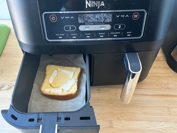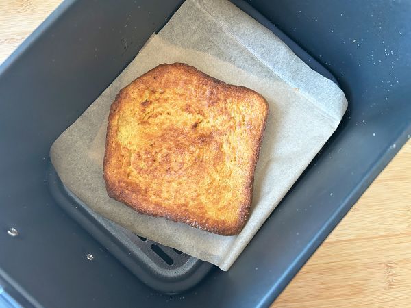 Den Boden des Frittierkorbs mit Backpapier auslegen. Die Torrijas so platzieren, dass sie sich nicht überlappen. Beide Seiten mit etwas Öl besprühen (wenn Sie möchten, können Sie das Öl durch einige dünne Scheiben Butter ersetzen). Beide Seiten mit Zucker bestreuen.