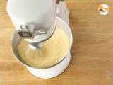 Weichen Sie die Gelatineblätter in sehr kaltem Wasser ein. Geben Sie die Eier und den Zucker in eine Schüssel und schlagen Sie sie mit dem elektrischen Handrührgerät 5-10 Minuten lang, bis sich ihr Volumen verdoppelt hat.