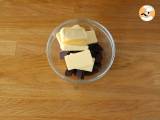 Schmelzen Sie die Schokolade mit der Butter. Geben Sie in die noch warme Mischung die gut ausgedrückte Gelatine und rühren Sie, bis sie sich gut aufgelöst hat.