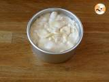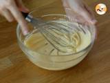 Die Flan-Zubereitung in die Form gießen und mit der Kuchenzubereitung bedecken. Stellen Sie die Form in die Fettpfanne des Backofens und füllen Sie sie mit kochendem Wasser, sodass ein Wasserbad entsteht.