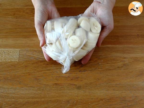 Die Bananen in Scheiben schneiden und in einen Gefrierbeutel legen. Für mindestens 4 Stunden ins Gefrierfach legen.