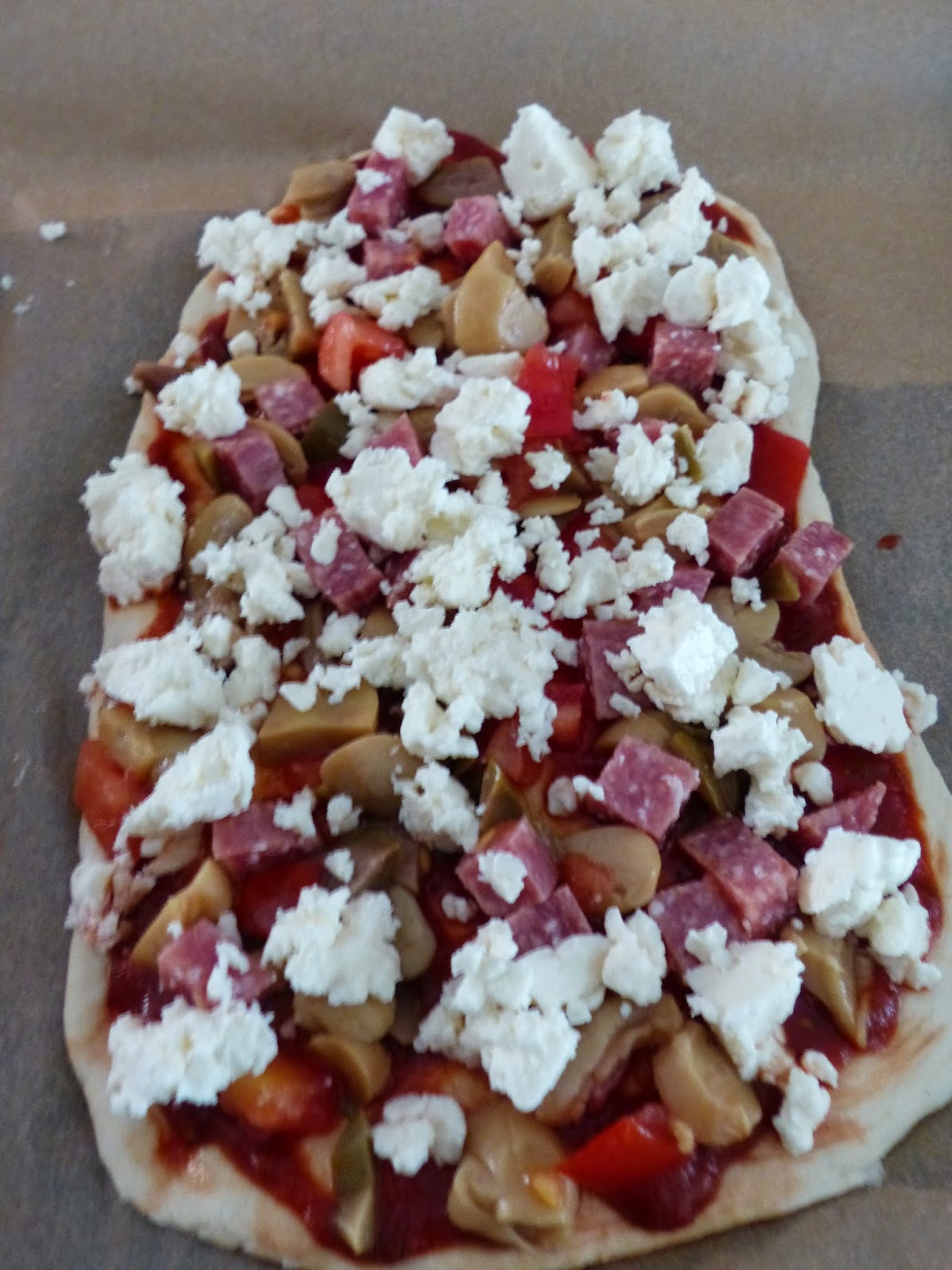 Den Teig vierteln und auf einer bemehlter Fläche zu einem Fladen ausrollen. Die Fladen auf ein mit Backpapier ausgelegtes Blech legen. Mit Sugo alla contadina bestreichen und mit Champignons, Salami, Oliven, Paprika, Tomaten und zerkrümeltem Schafkäse belegen. Zum Schluss mit den Kräuter bestreuen.