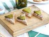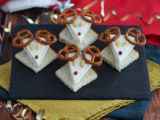 Zutaten: 1 Scheibe Toastbrot 4 dreieckige Streichkäsesorten Typ Kuh, die lacht 8 Mini-Brezeln 8 Pinienkerne 4 rosa Beeren