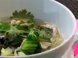 Zutaten: ca. 350 g Hühnersuppenklein 3 Hühneroberkeulen 1 Bund Suppengrün 10 cm Ingwerwurzel, geschält, in feinen Streifen 2 Zwiebeln, geschält, in Ringen...