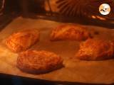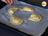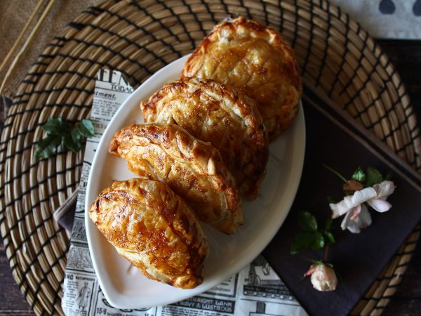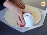 Rollen Sie den Blätterteig aus und zeichnen Sie mit einem Messer und einer Schüssel oder einem Keksausstecher 4 Kreise mit einem Durchmesser von 12 cm nach. Wenn Sie möchten, können Sie die Reste verwenden und sie zu zwei weiteren Kreisen ausrollen.