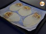 Rollen Sie die Kreise aus, sodass sie eine ovale Form erhalten. Auf eine Seite einen Esslöffel Haselnusscreme und einen Esslöffel Äpfel geben.